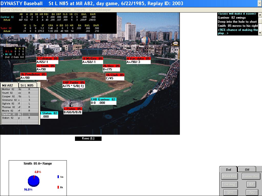 ![]() ![]() "I don't like magic. There's no transparency in other games. There's no real way of digging into it and figuring out what the logic behind determining the results is. That's the beauty of the table game. How does a player's range rating affect the game? You don't have a clue in other computer games on how ratings are used and when. In fact, you could have ratings that the computer never used and no one would know." — Dave Sausser Valencia, CA Why you'll love DYNASTY League Baseball Highly realistic, transparent and easy to play. ![]() Did you know DYNASTY League Baseball has been on display at the National Baseball Hall of Fame and is part of the permanent archives? Realism You Never Thought Possible Many times you can look back at a baseball game and find several "little things" — let's call them subtleties — that determined the outcome of the game. It might be a foul ball that just makes the stands in the tiny foul territory in Fenway Park that gives a hitter another life or the swirling wind in Candlestick Park that turns a routine fly ball into an adventure for a visiting team player. It's one of the reasons why we love baseball. Fenway Park's Tiny Foul Territory gives hitters an extra life (89% chance of a foul into the stands instead of being caught in fair territory)and increases batting averages at Fenway. DYNASTY League Baseball uses an upgraded version of the Pursue the Pennant game engine. "It's Pursue the Pennant perfected!" Realism and attention to Baseball's subtleties is at the heart of the design of DYNASTY League Baseball and is what makes the game so fascinating to play. The goal was to make DYNASTY League Baseball even more realistic and accurate yet easier to play than the game I previously designed — the Pursue the Pennant board game. DYNASTY League Baseball is truly Pursue the Pennant perfected. Back in the Spring of 1992 when we first started working on the concept of the game design concept, I was discussing my approach with Dave Sausser, a friend of mine from California. Dave was explaining that what he really wanted to see was the DYNASTY League Baseball Board game translated into a computer version. He did not want a black box "computer game". He wanted a transparent game that played on the computer. As Dave explained; "I don't like magic. There's no transparency in other games. There's no real way of digging into it and figuring out what the logic behind determining the results is. That's the beauty of the table game. How does a player's range rating affect the game? You don't have a clue in other computer games on how ratings are used and when. In fact, you could have ratings that the computer never used and no one would know." Ozzie Smith will shows off his A+ range rating for you on plays deep in the hole at shortstop. You know exactly when Ozzie's range rating comes into play and what % chance he has of making the play vs. other shortstops. ![]() "I have received the 3rd edition charts and played my first game which I enjoyed greatly. I find your layout very easy to grasp and realistic. Your web page nailed it on the head with the quote from your friend Dave about not wanting magic and the need for transparency. I will be playing a greatest team tournament while I am on the road covering stories for ESPN. Congratulations on a great game and even finer service." Andrew Lockett — ESPN Outside the lines Producer Pop Up Detail: Wrigley Field wind is the difference between a HR into the basket or a warning track out IIn April and May the wind often comes off Lake Michigan (less than a mile to the east), which means a northeast wind "blowing in" to knock down potential home runs and turn them into outs. In the summer, however, or on any warm and breezy day, the wind often comes from the south and the southwest, which means the wind is "blowing out" and has the potential to turn normally harmless fly balls into home runs. A third variety is the cross-wind, which typically runs from the left field corner to the right field corner and causes all sorts of interesting havoc. Depending on the direction of the wind, Wrigley can either be one of the friendliest parks in the major leagues for pitchers or among the worst. Before the game starts playing DYNASTY League Baseball, you will see the weather being determined based on actual weather bureau data by month, day or night, ball park and region. |
